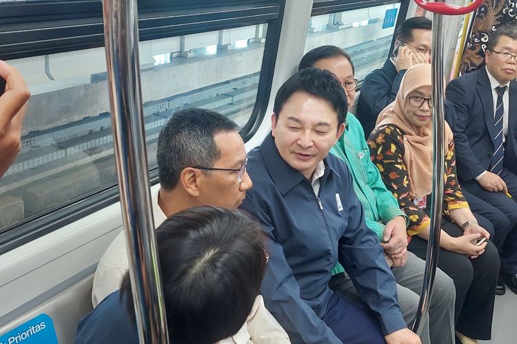 Penjabat Gubernur DKI Jakarta, Heru Budi Hartono mendampingi Menteri Agraria, Infrastruktur, dan Transportasi Korea Selatan, Won Hee Ryong, menjajal rangkaian light rail transit (LRT) fase 1A untuk pertama kalinya, Jumat (17/3).